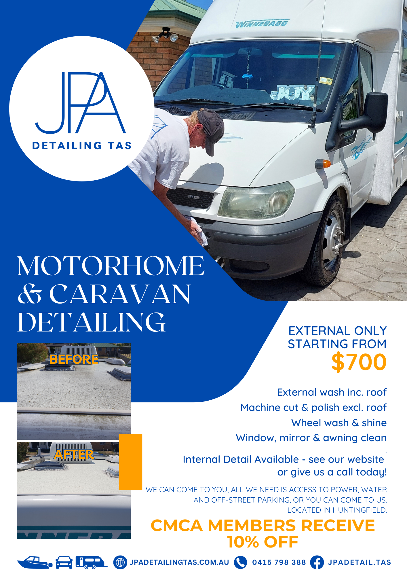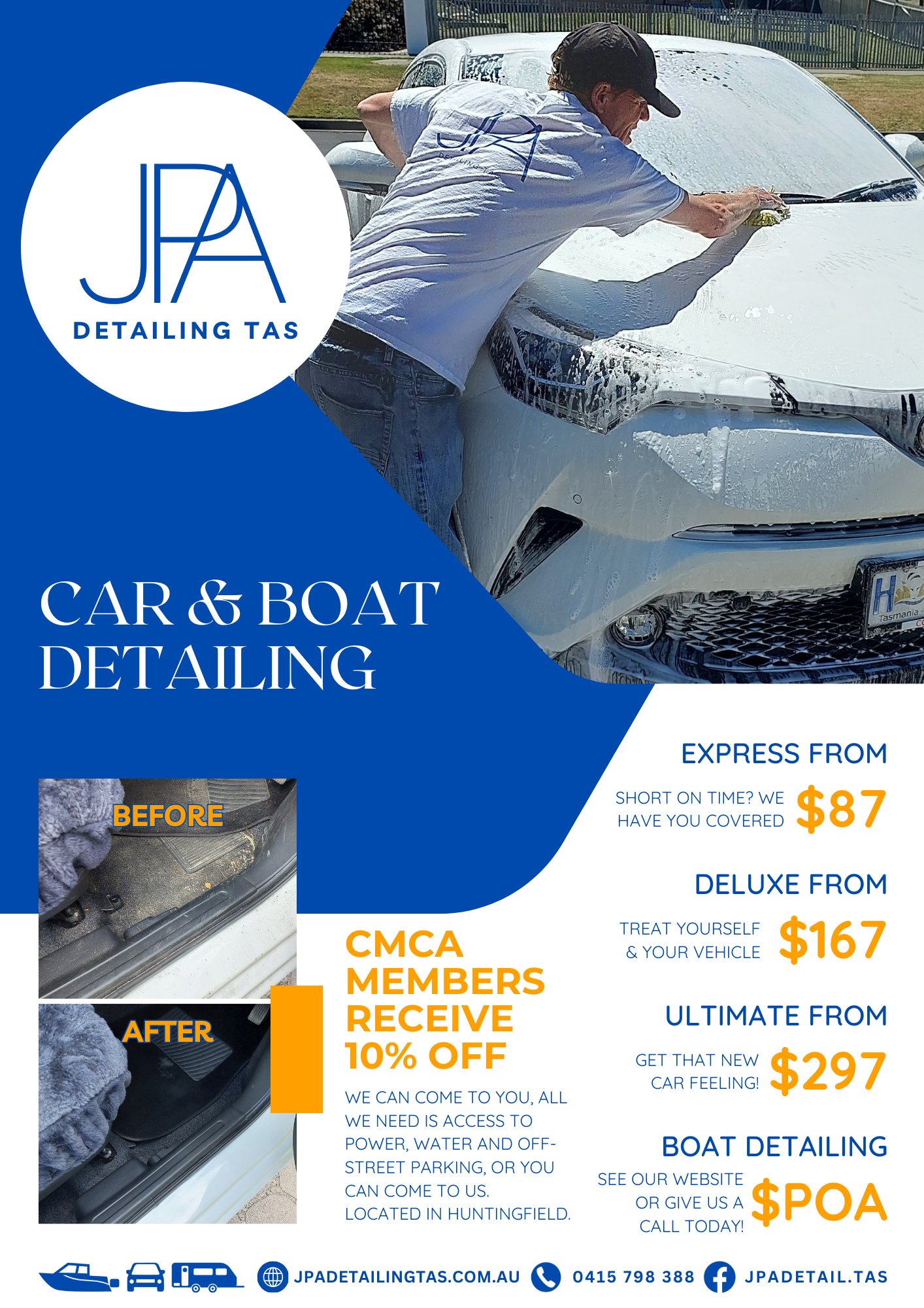Contact us by phone or email at jpadetailing.tas@gmail.com