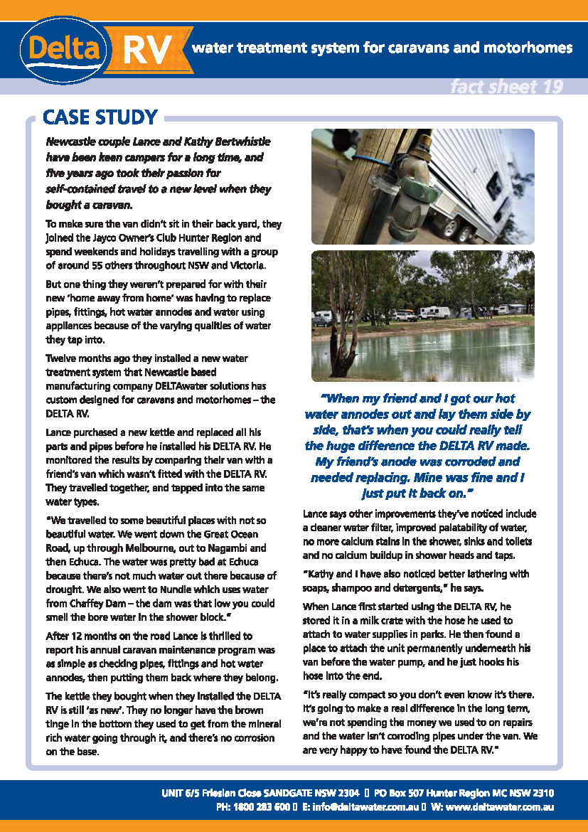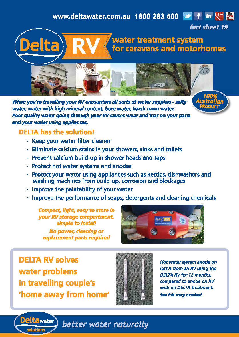 The Delta RV Water Treatment System is designed to protect your RV’s parts and water using appliances against exposure to harsh water supplies, such as salty water, bore water, or water with a high mineral content. It will eliminate calcium stains and build-up, protect hot water system anodes, improve water palatability and keep pipes clean.