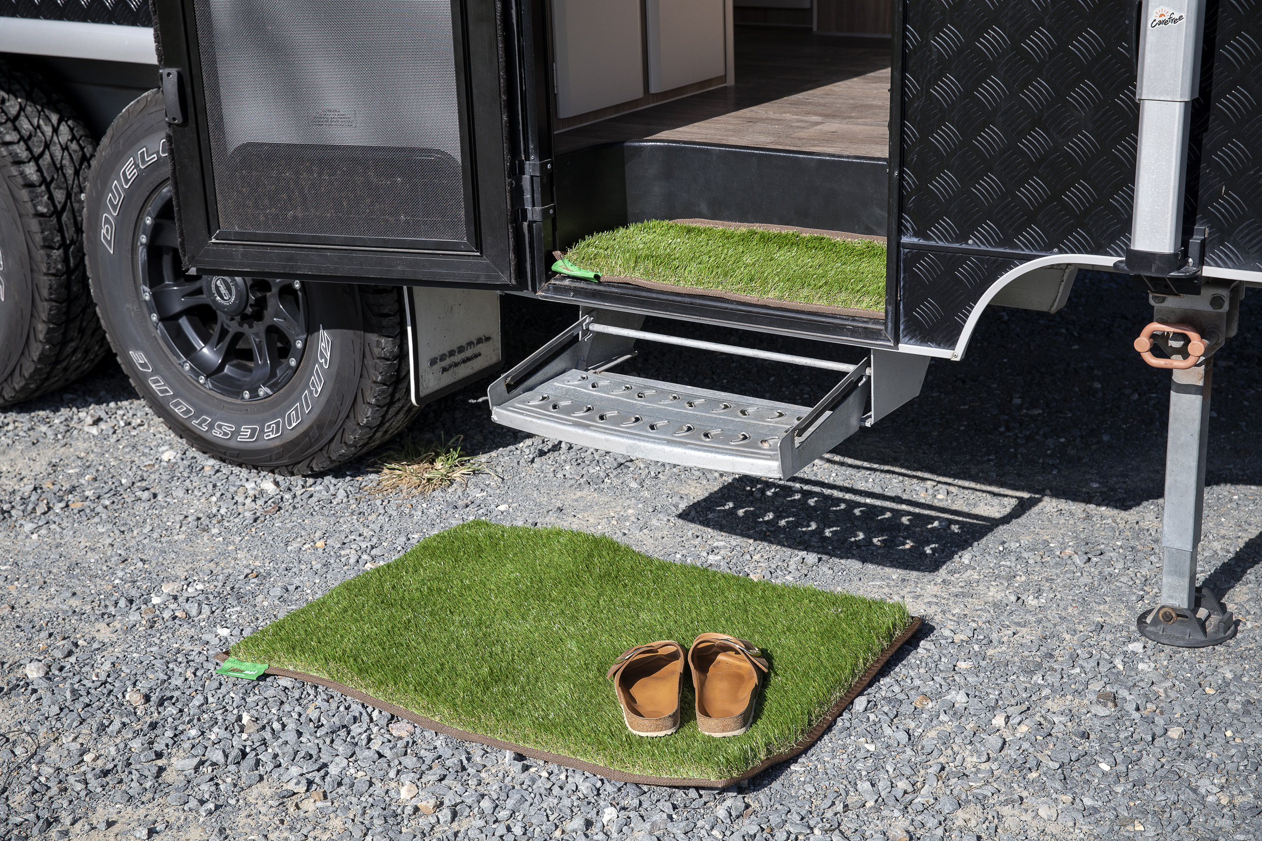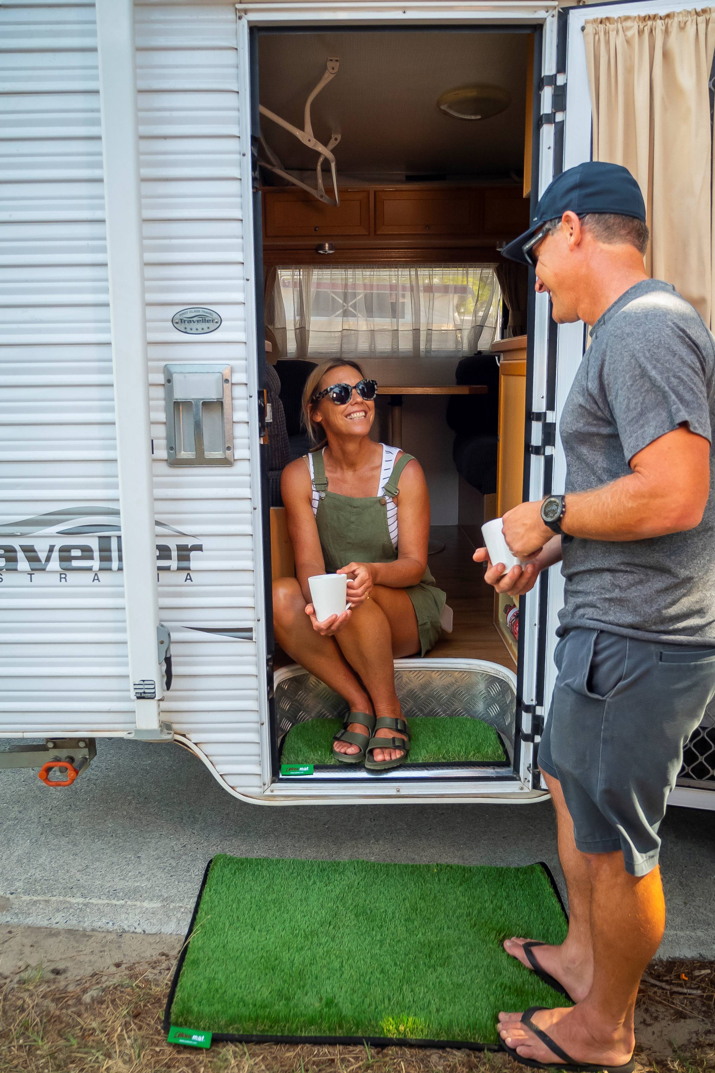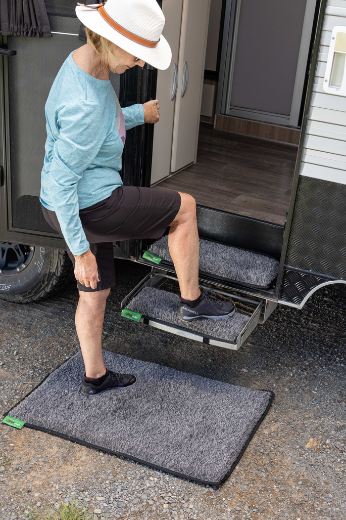 THE MUST HAVE MAT. Keeping dust and dirt out of your caravan or Motorhome has never been easier! muk mats have a super deep pile to capture all the muk before you enter the van with a design to fit both inside and outside steps, plus handy velcro straps to keep the outside ones in place. Whether you’re going on a surf trip or heading out bush, we’ve got the solution to keeping your caravan clean so you can spend more time enjoying your trip and less time cleaning up. Every Aussie’s favourite patch of grass. Designed for the outdoors, but perfect for the whole family wherever you are. Get the muk off your feet and shoes, leave the mess outside with muk mat. Earthy trim colours to choose from. Made from recycled materials. Designed for the love of the great outdoors